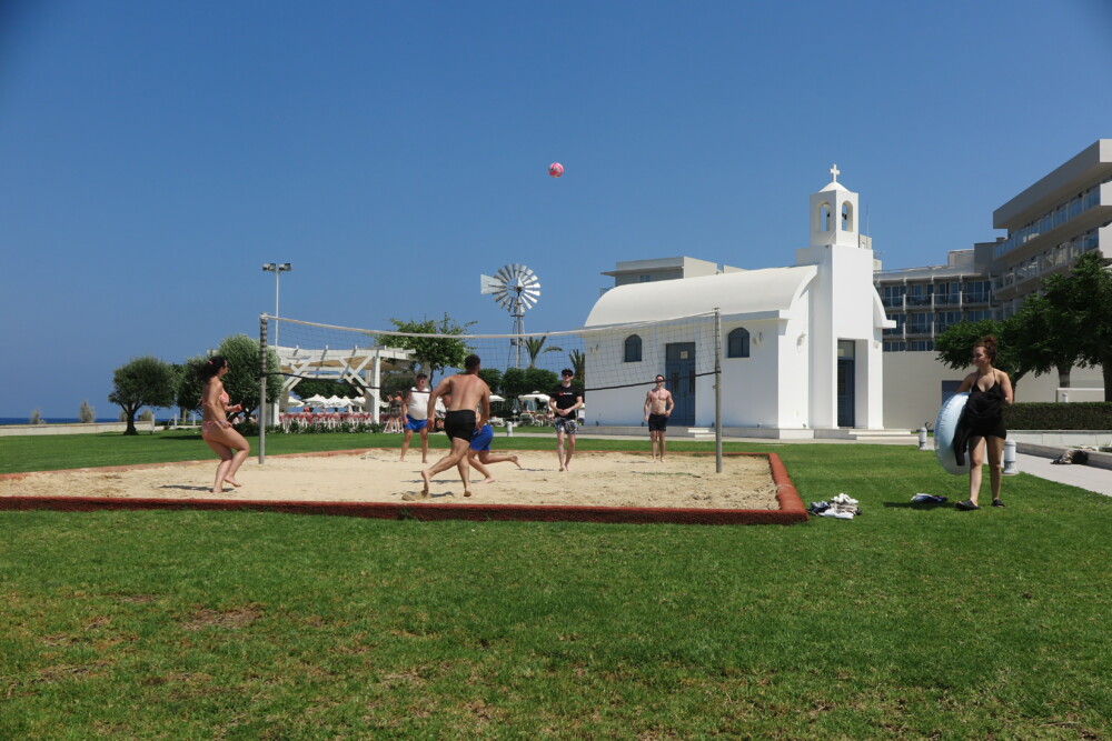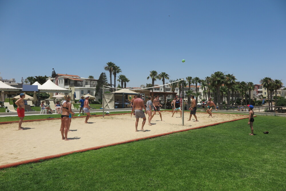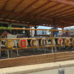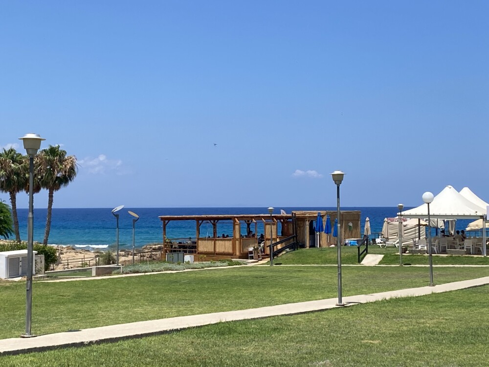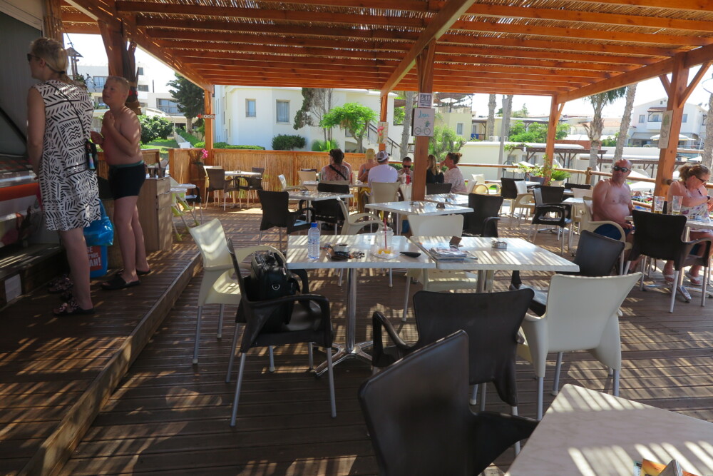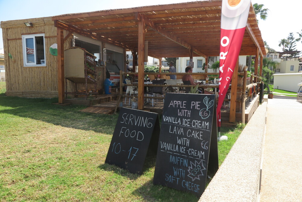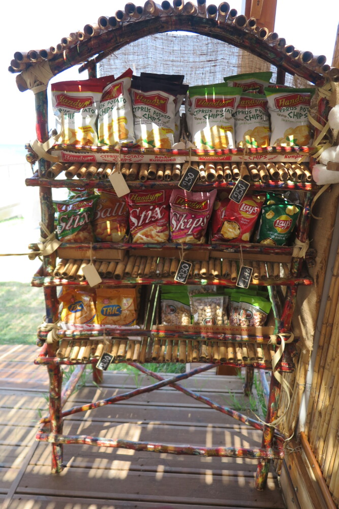 It’s all sort of lean-to-Tikki-style shack on the beach, all wood and lots of bamboo … out front the aroma of freshly watered lush green grass lawns, a beach volleyball court, and outdoor seaview massage booths. A gorgeous spacious veranda, covered with bamboo, creates delightful shaded patterns to enjoy your stay, with stunning sea views over Pernera Bay. I love stuff like; Speis’ handmade crisps shelf and the colourful signage on the wooden rails that run down the side of the cafe