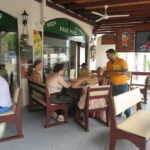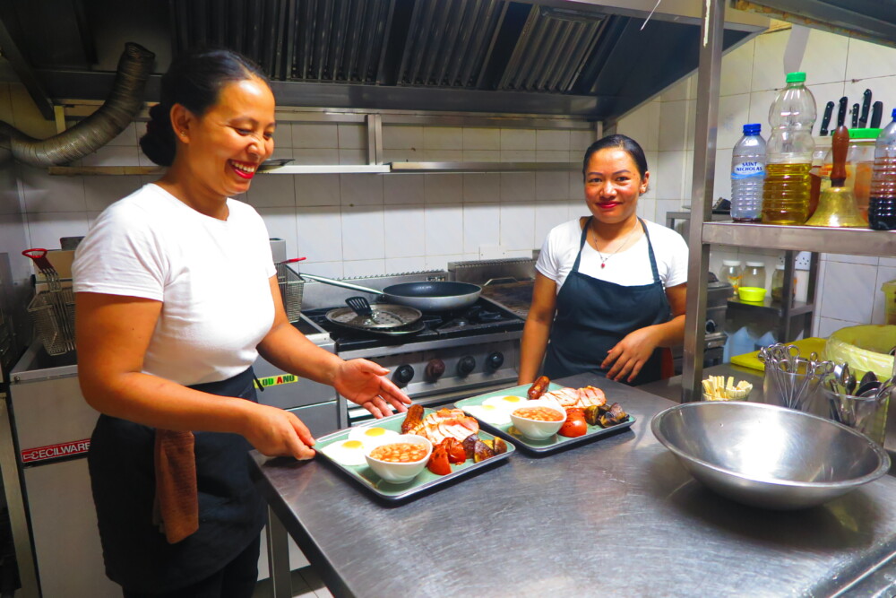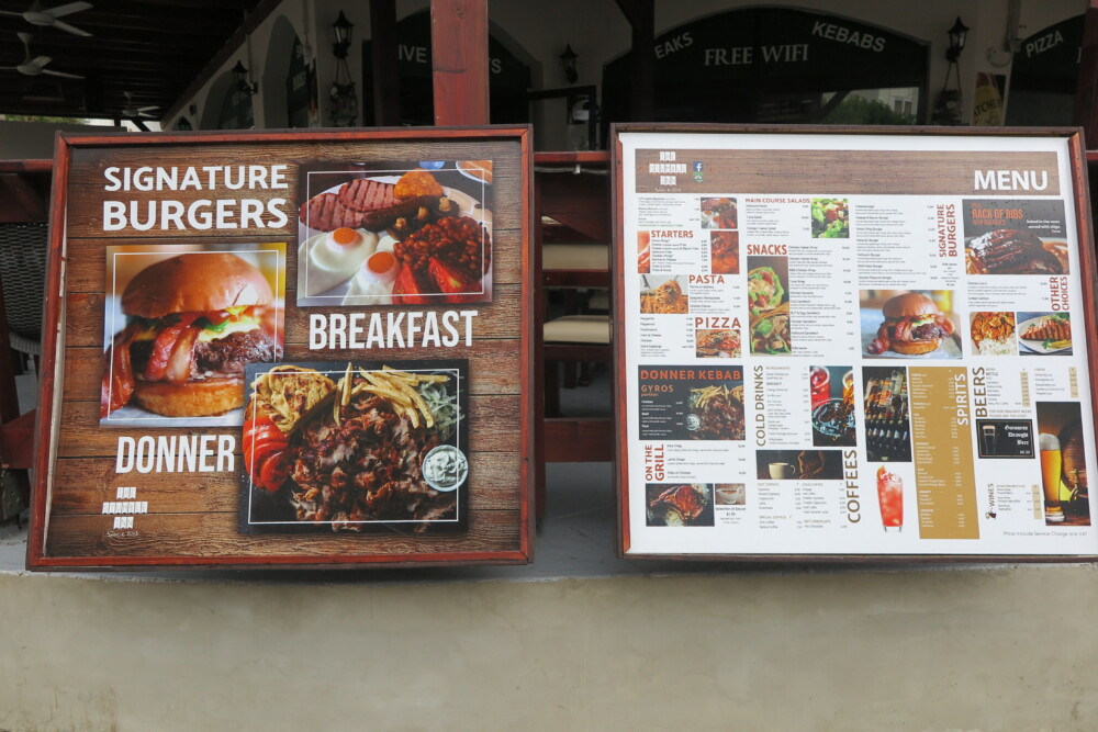 The place looks traditionally British, well, it’s on a corner for starters, but these days it’s got a European twist as lots of their repeat clients are from various parts of Europe, particularly Scandinavia. There’s a covered terrace all the way around, the decor; lots of wood, comfy benches, colourful tables, low or high … a row of tall red stools surrounding the bar, oh and blackboards everywhere.